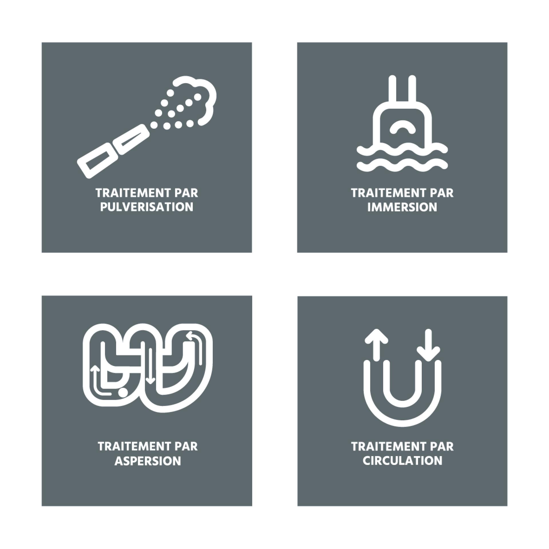 Par immersion/circulation (10-50g/l // 40 à 60 °C),