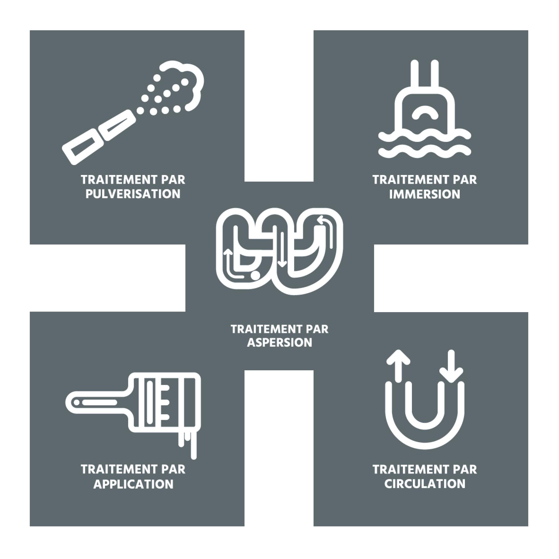 Utilisation par IMMERSION, APPLICATION, ASPERSION, CIRCULATION ou PULVÉRISATION.